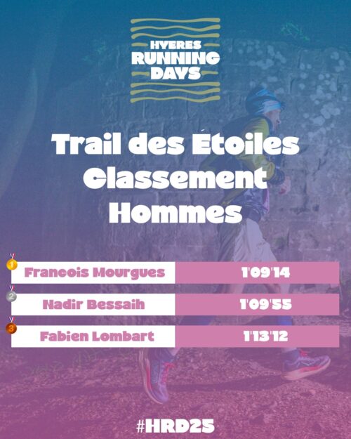 Podiums de l'édition 2025Trail des étoilesCorporat'RunChallenge Parents / Enfants Catégorie : ActualitésPar Ingenieweb13 décembre 2025 Partager à vos amis Partager sur FacebookPartager sur Facebook Share on XPartager sur X Navigation articlePrécédent Article précédent :Listes des participantsA suivre égalementListes des participants12 décembre 2025Un plateau de très haut niveau sur la PROM’Hyères11 décembre 2025HRD25: C’est parti avec les Lutins !11 décembre 2025Plan des parkings11 décembre 2025Un évènement solidaire9 décembre 2025Derniers dossards8 décembre 2025